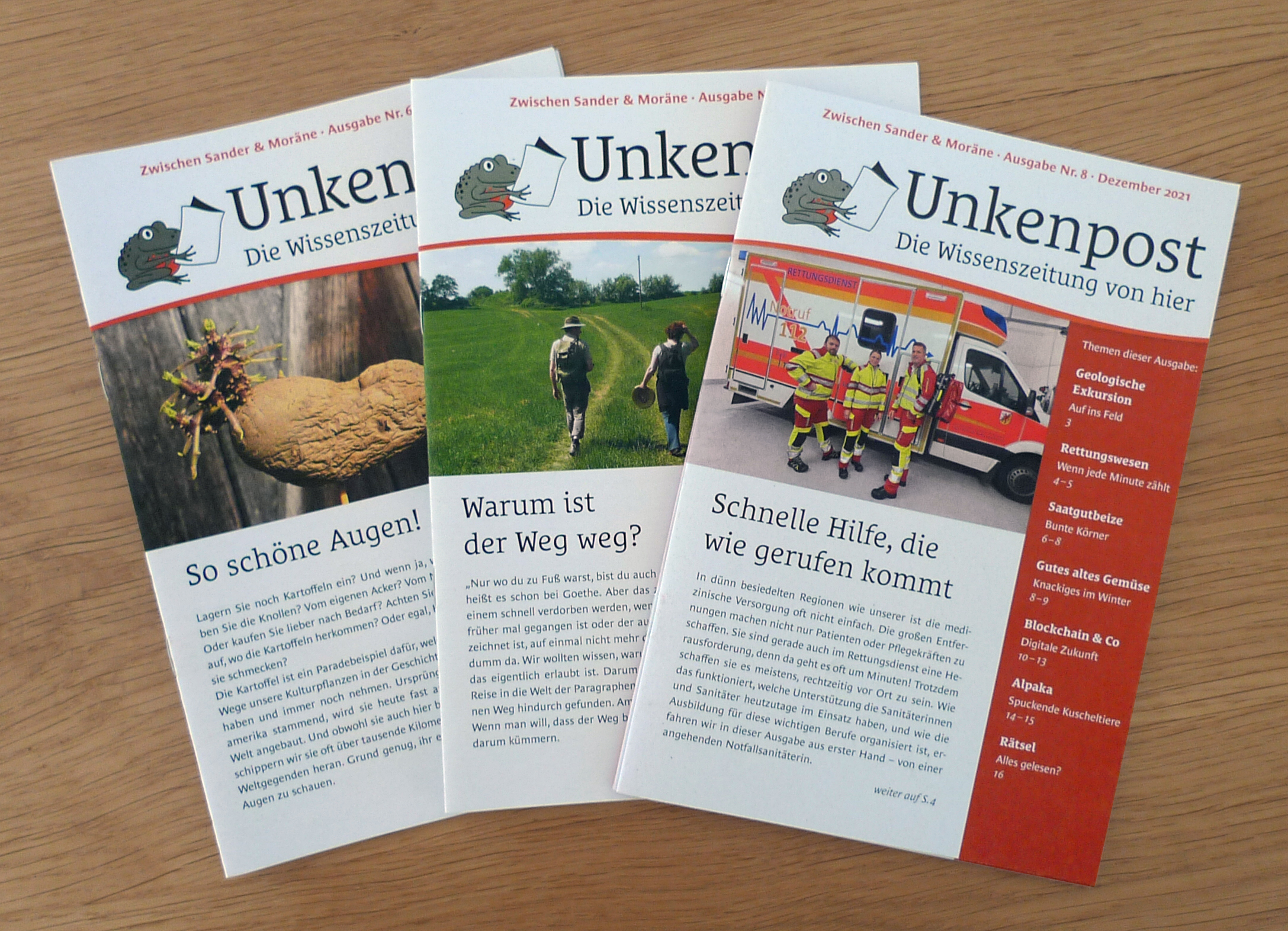 Die Unkenpost ist eine kleine lokale Wissenszeitung, von uns vor Ort gemacht, für Sie als Leserinnen und Leser in der Region. Sie sammelt Ihre Fragen zu Forschung und Technik, Geschichte, Gesundheit und Natur, Dinge, die Ihnen auffallen oder die Sie schon immer einmal wissen wollten.